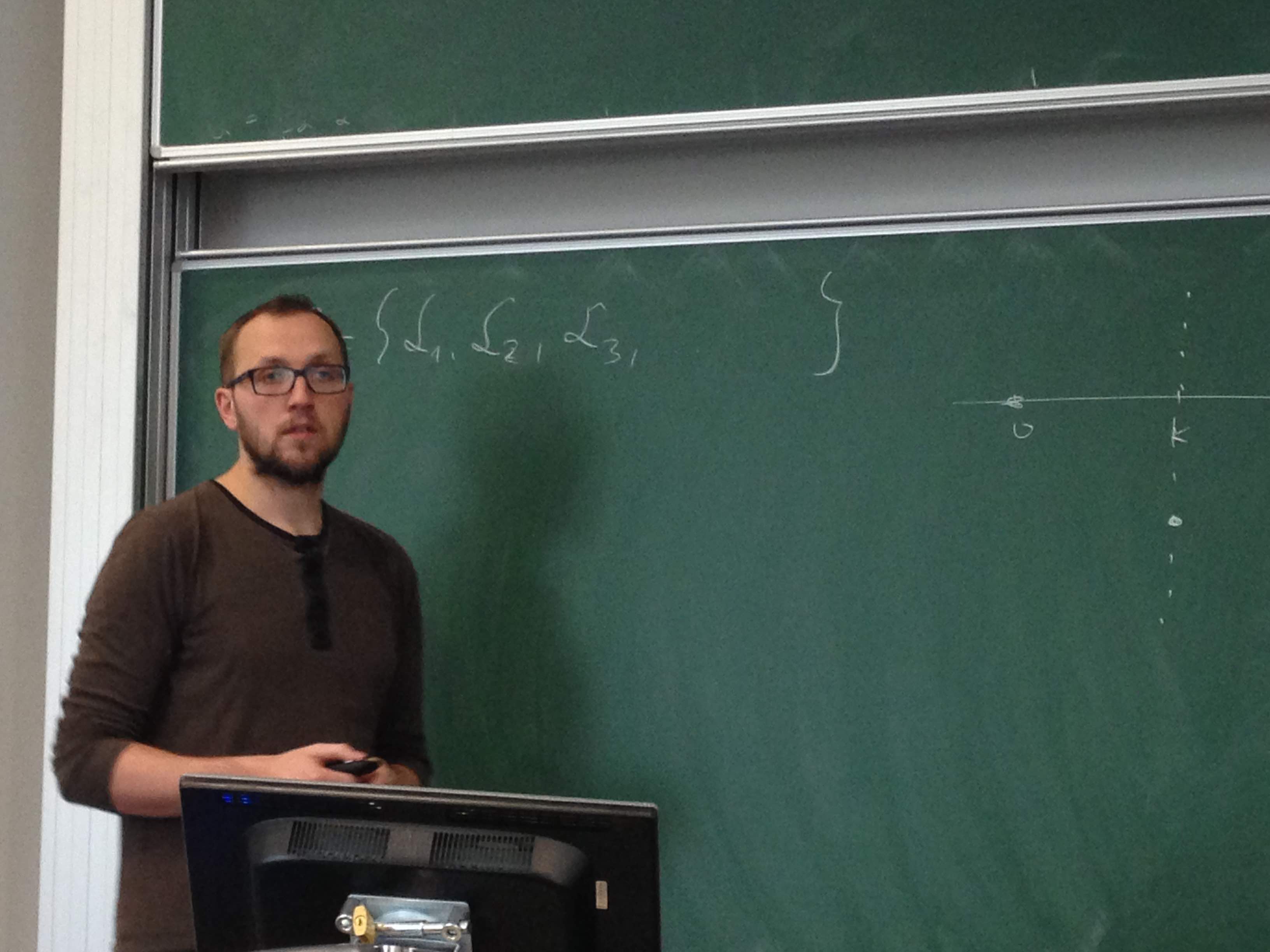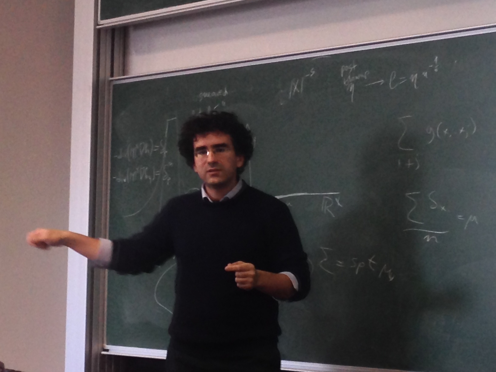 | 10.05.2012 | Nathanaël Berestycki (University of Cambridge) A new approach to coalescing flows The Brownian web is a process which was introduced by Arratia (1979) and Toth and Werner (1997), and which formally corresponds to starting coalescing Brownian motions from every space-time point. Inspired by the work of Schramm and Smirnov on the scaling limit of critical percolation, we provide a new state space and topology for this process which greatly simplifies several fundamental questions regarding this process. In particular, an invariance principle for coalescing random walks is proved under an optimal assumption of a moment of order two. In previous works, a moment of order three was shown to be both necessary and sufficient for this result to hold. Our approach is sufficiently simple and general that we can handle substantially more complicated coalescing flows with little extra work -- in particular similar results are obtained in the case of coalescing Brownian motions on recurrent fractals such as the Sierpinsky gasket. Joint work with Christophe Garban (ENS Lyon) and Arnab Sen (Cambridge). |